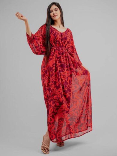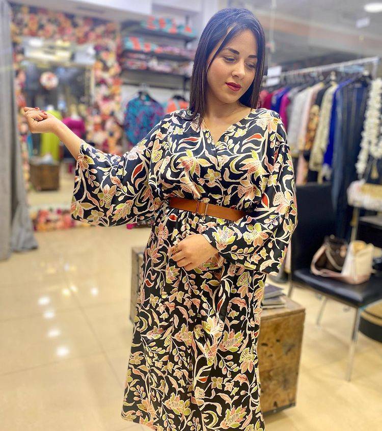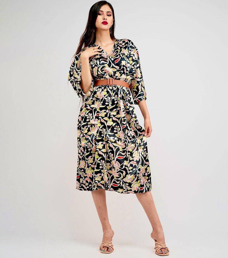 ‎تالقي بفستان كله شياكة و اناقة، من الساتان الحريري المرسوم نوعية رفيعة، مع حزام مهدى قطعة يجب ان تكون في خزانة كل انيقة